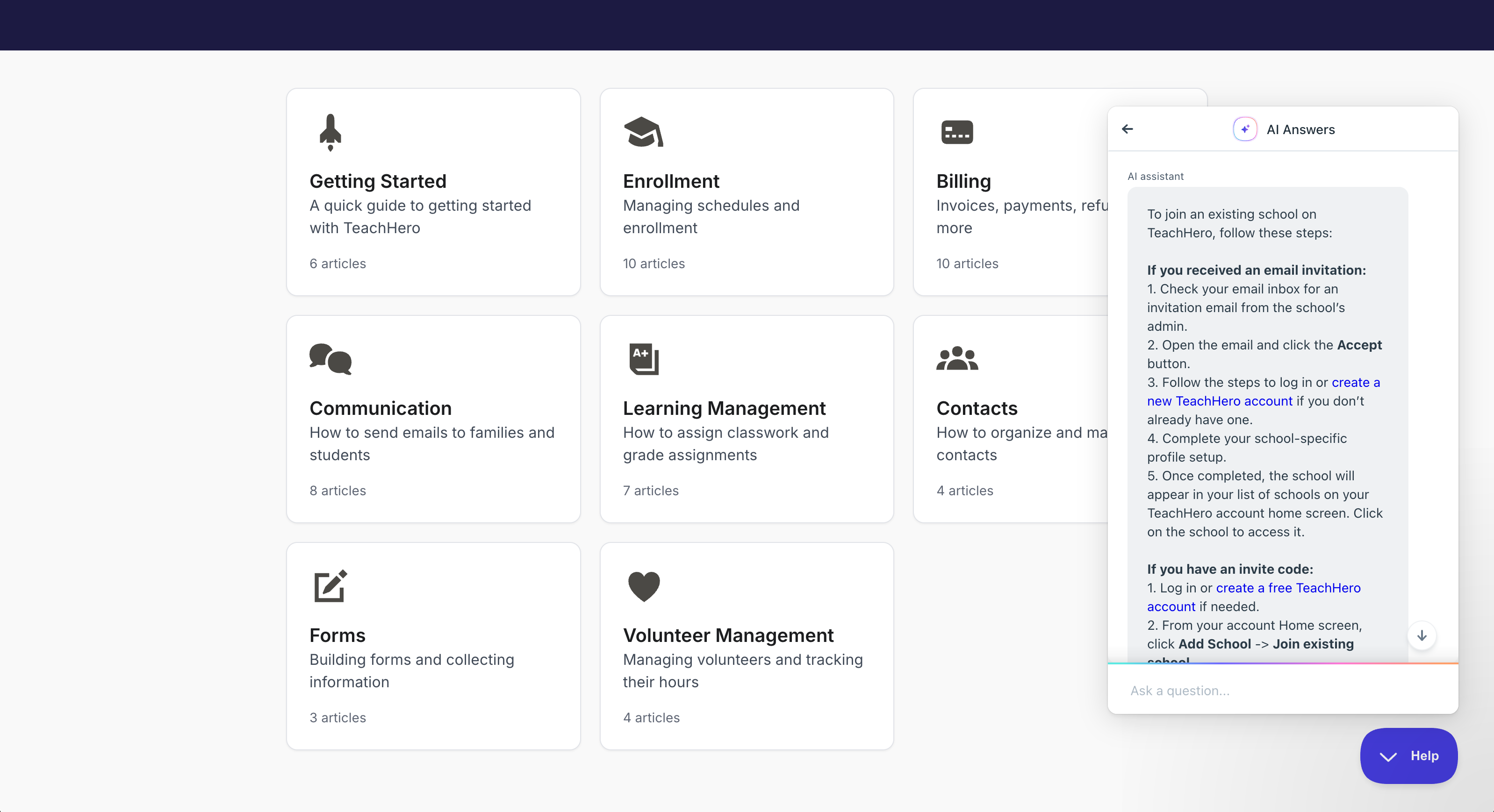 The help center features an improved design and a new AI Answers feature that lets you chat with an AI bot about TeachHero and the Help Center. Get instant answers without searching through articles. Click the Help bubble in the bottom right corner and select AI Answers to get started.